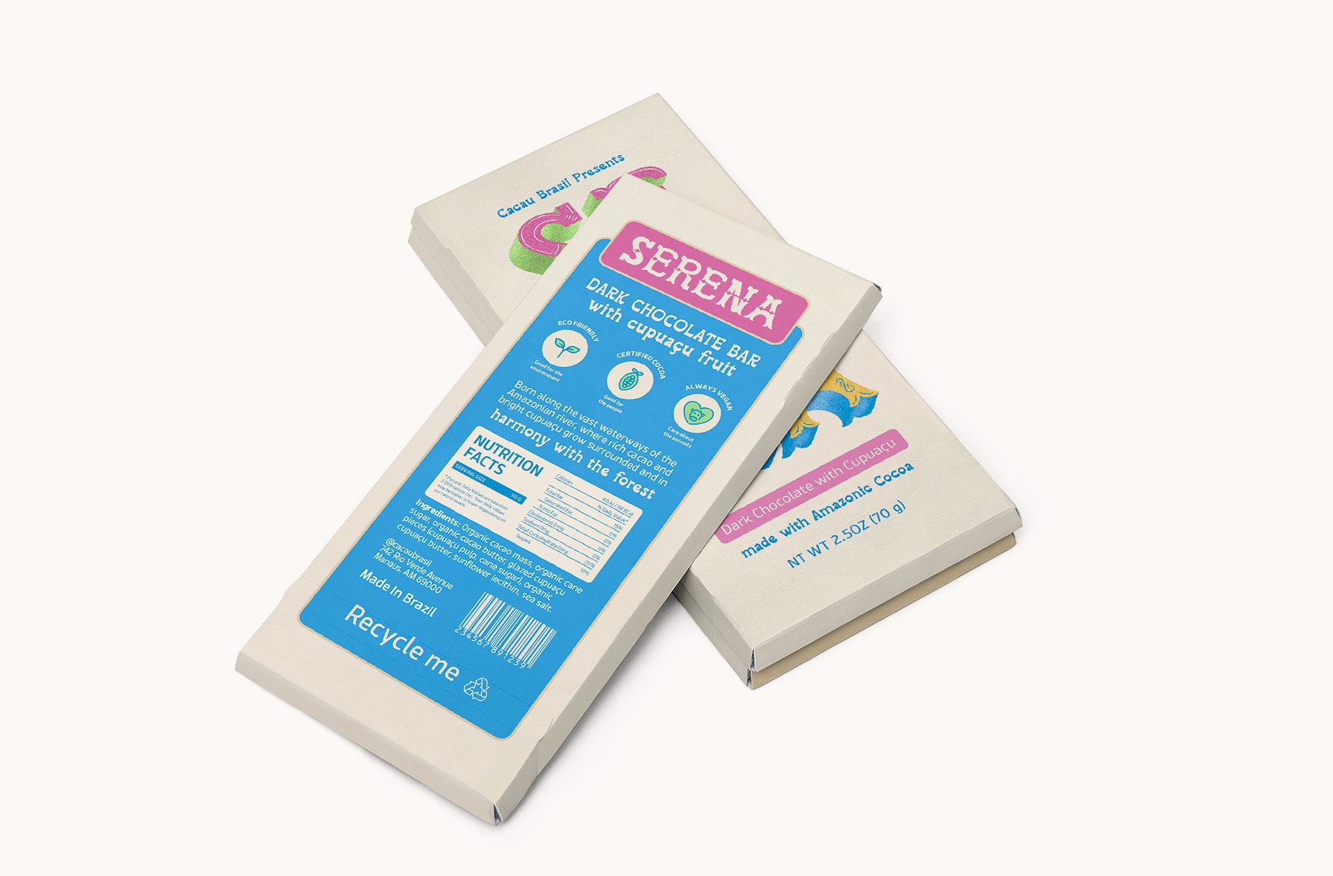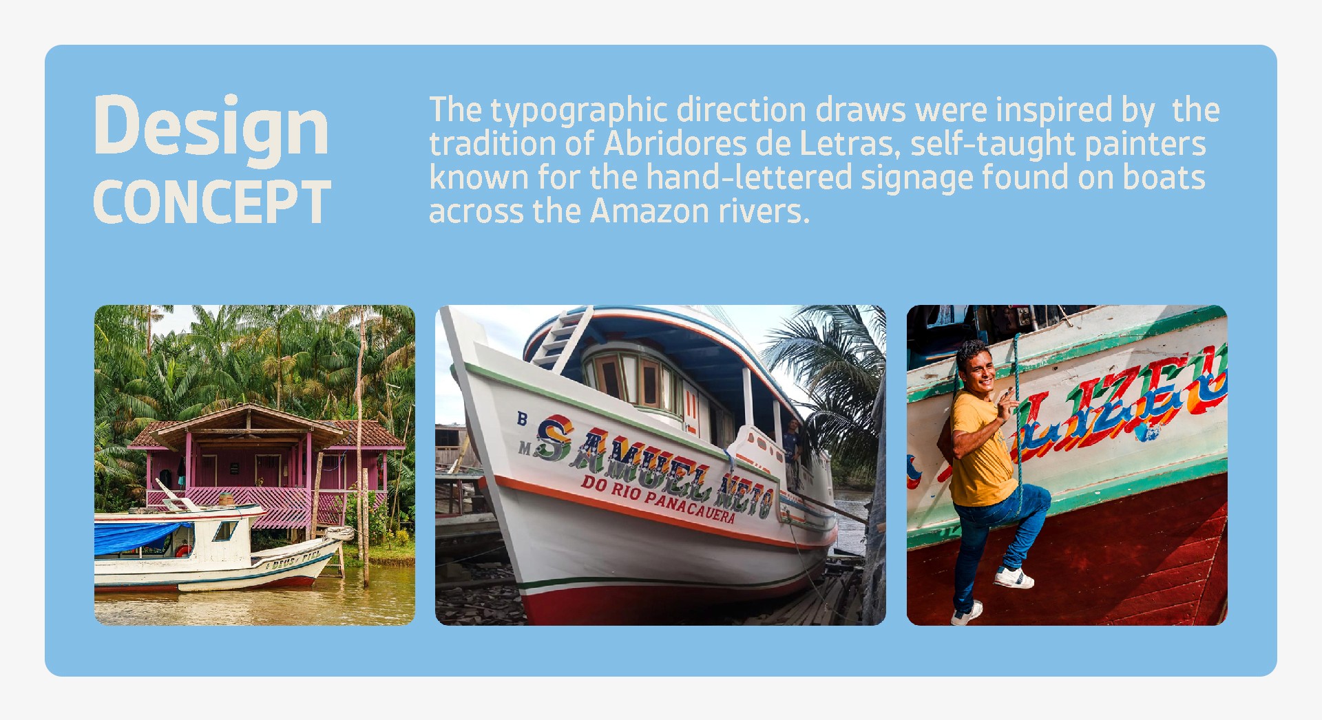 A chocolate brand inspired by Amazonian ribeirinha communities and their traditional hand-painted boat lettering, using this visual language to highlight people and cultural identity.